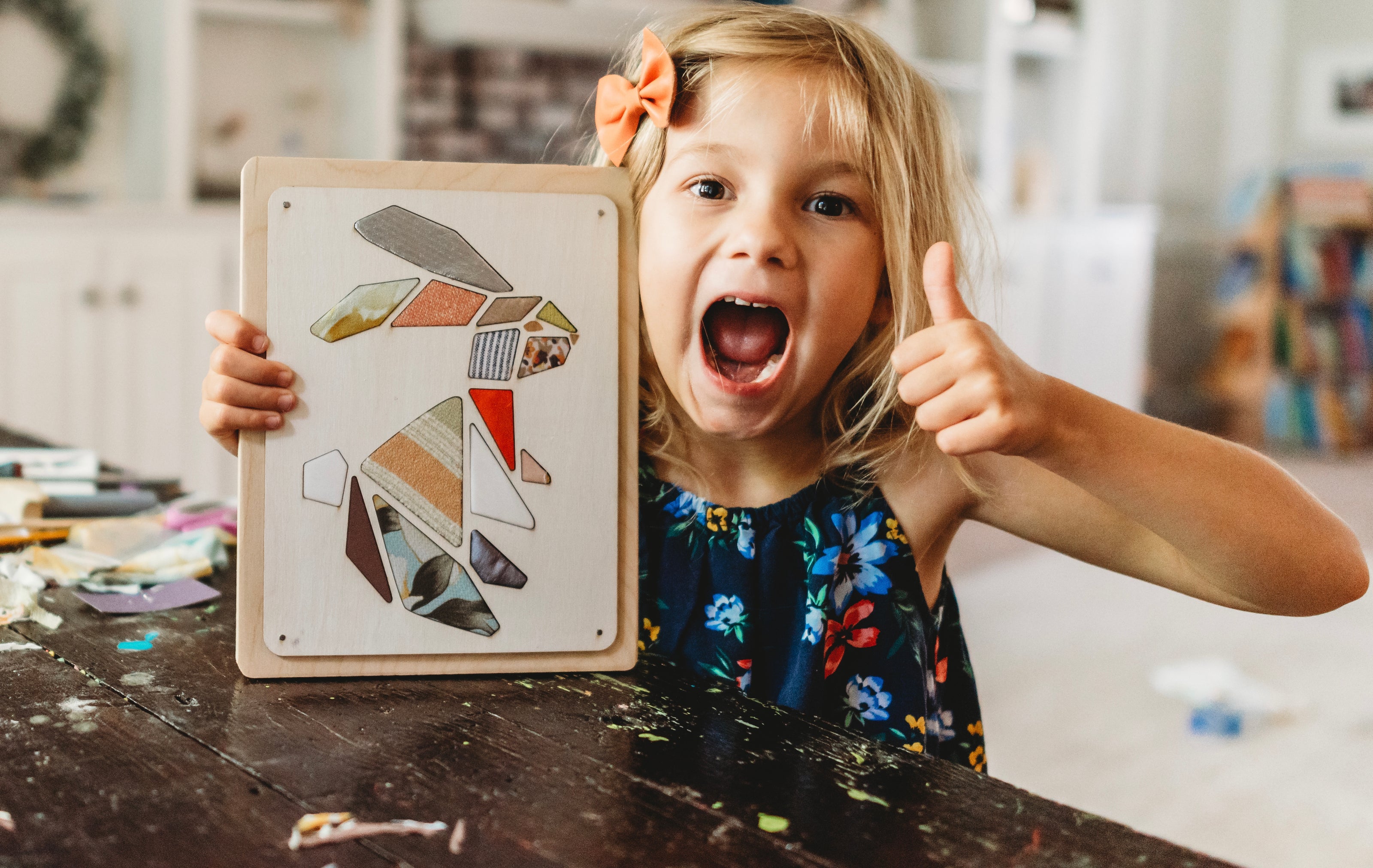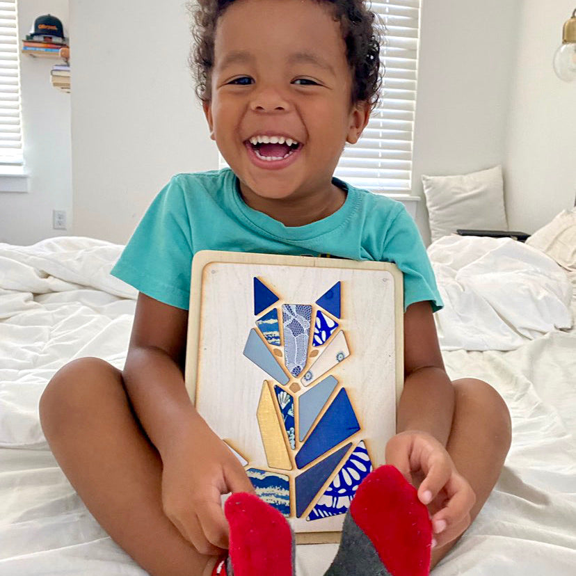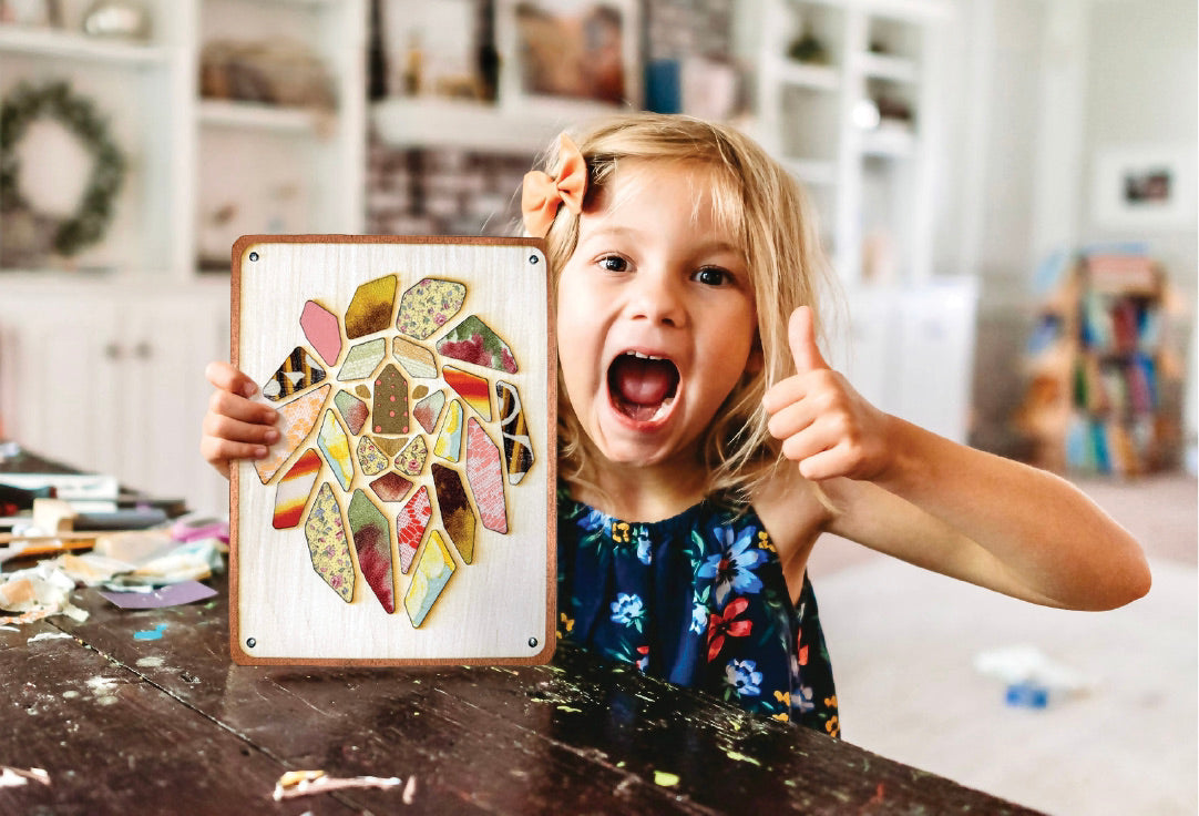 My 6 year old and I had such a lovely morning creating this together. I think this is a brilliant and unique way to get kids into art and mixed media. His favorite parts were choosing his square and fabric and then using the hammer. And I found the process very relaxing! If I can just offer a little critique, I bought one for my 3 year old daughter but she would not have the capabilities to complete this. My son needed a lot of help, as the fabric was a little tricky to fit into the shapes and he struggled with the cutting. But again, I really enjoyed getting to help him make this one of a kind piece of artwork and he is very proud of it!